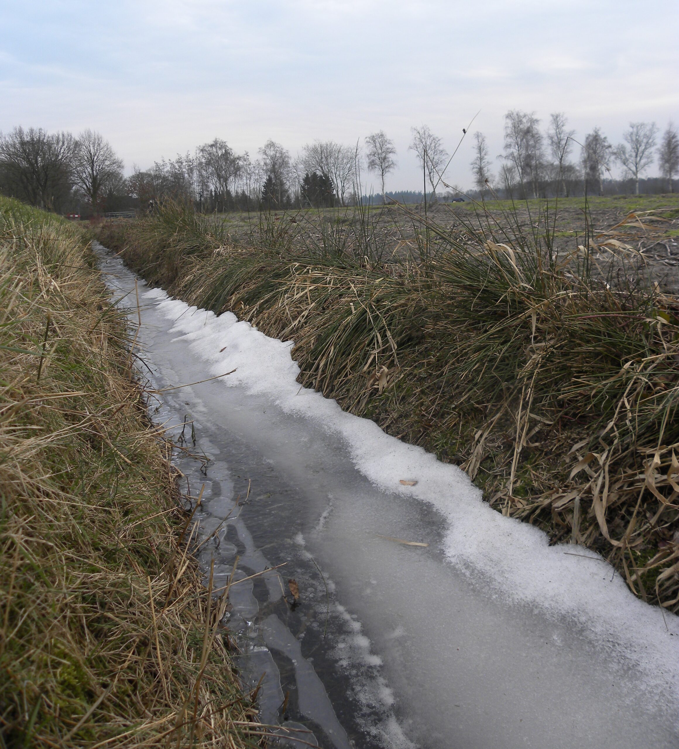 Sloot met oude sneeuw; op de achtergrond de Grensweg